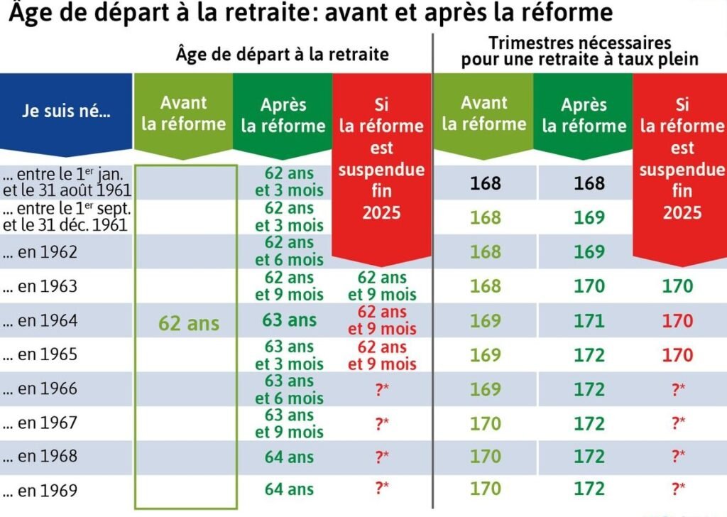 Pour les générations nées en 1963 et 1964, l’âge légal serait bloqué à 62 ans et 9 mois, et le nombre de trimestres nécessaires pour partir sans décote serait gelé à 170 (soit 42 ans et 6 mois de cotisation). Sans la suspension, les personnes nées en 1964 auraient dû partir 3 mois plus tard et cotiser 3 mois de plus.